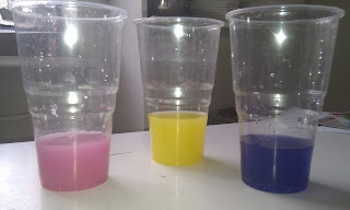 - tikmēr sagatavo krāsainu ūdeni nākamajai kārtai (kamēr lielās glāzes "saldējās", piepildījām mazākās un tāpat kā iepriekš ūdeni iekrāsojām);