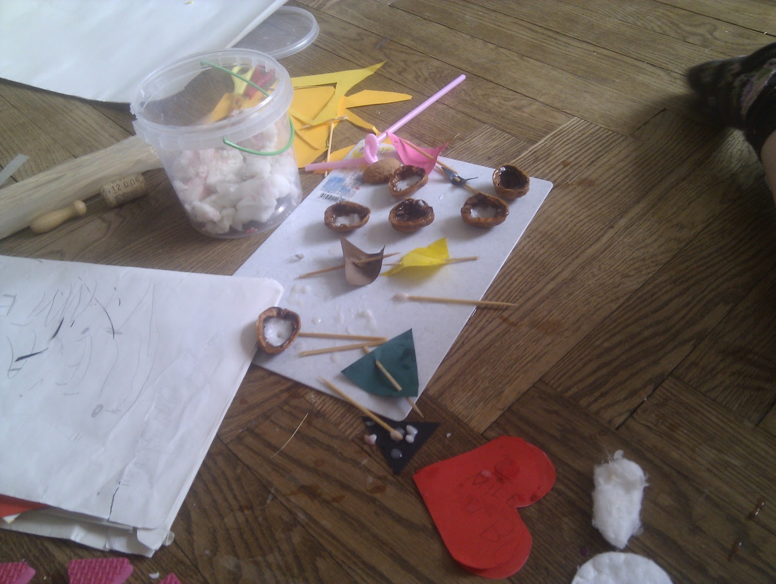 Sākumā taisījām plastalīna bumbiņas un centāmies ar tām iestiprināt/nostiprināt "mastu" laiviņā. Bet ieliktas ūdenī, laivas visbiežāk strauji nogrima vai vismaz apgāzās uz sāna... Samazinājām plastalīna daudzumu. Situācija uzlabojās, tomēr ne tik ļoti, kā gribētos. :)
